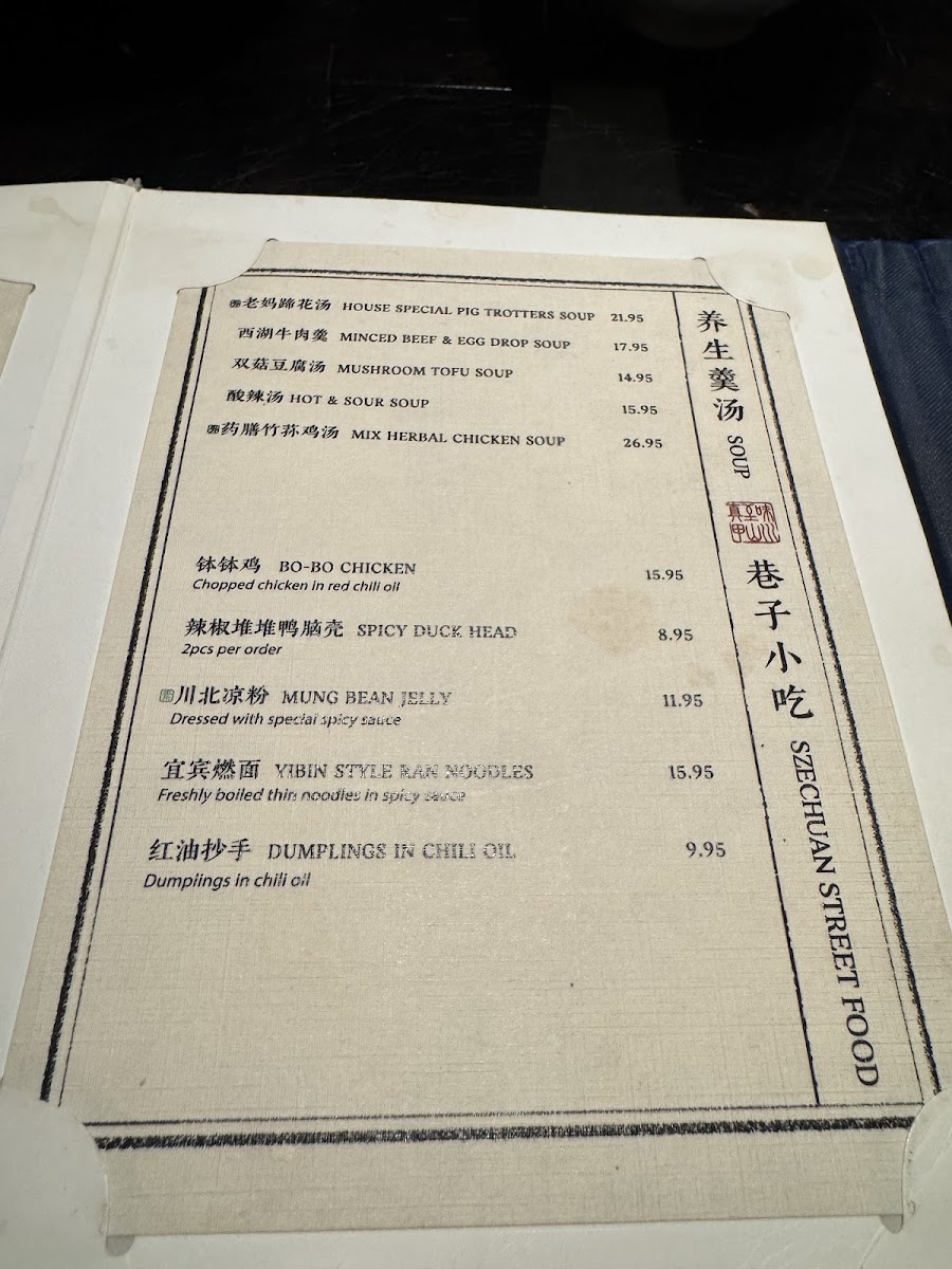 The menu offers a diverse selection of Sichuan and traditional Chinese dishes, showcasing a range of flavors from spicy to mild. It is organized into distinct categories including Szechuan Special Street Food, Traditional Cuisine, and a selection of soups and vegetarian options.