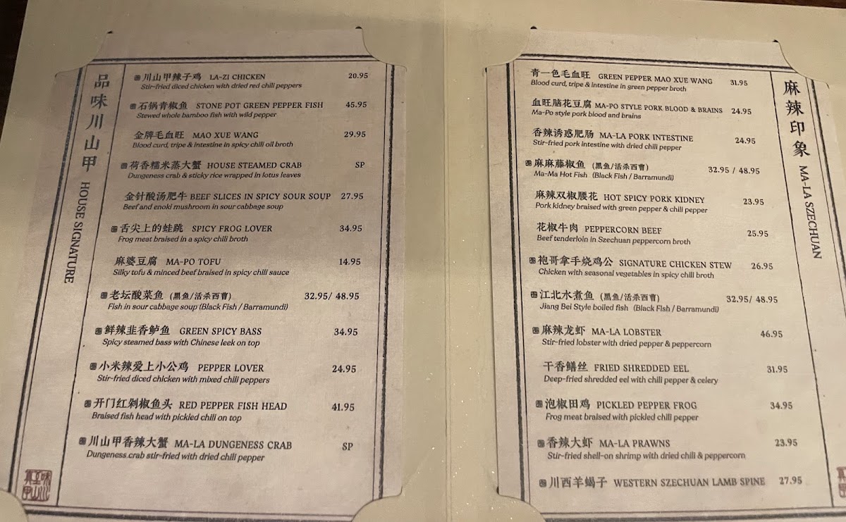 Some dishes highlight distinctive Sichuan flavors and ingredients, like Mapo Tofu, MA-La Dungeness Crab with Bones, and spicy street-style preparations. The menu allows for customization of spice level to accommodate different preferences.